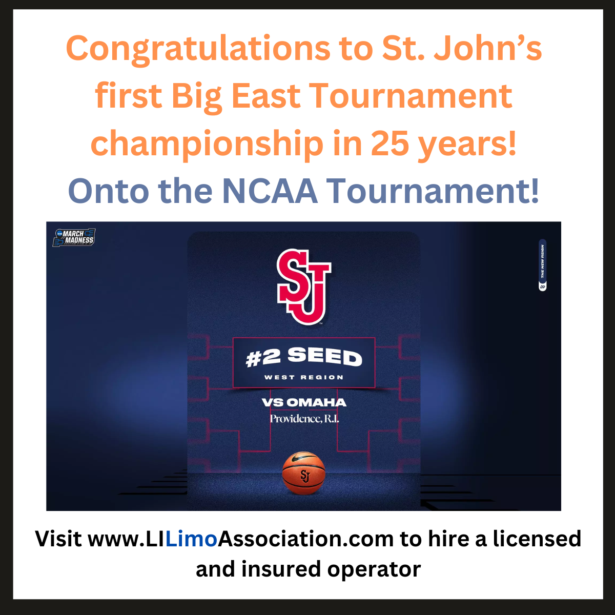 LILA extends our congratulations to St. John’s Men’s Basketball on winning their first Big East Tournament championship in 25 years! Onto the NCAA Tournament! #LILA #LongIslandLimoAssociation #HireLicensed #DoTheRIghtThing