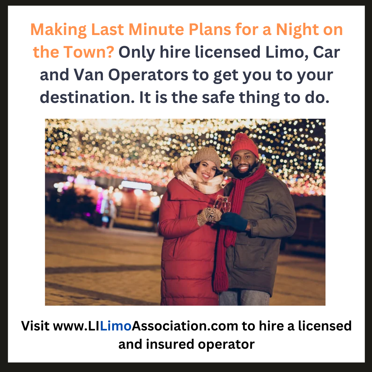 Making Last Minute Plans for a Night on the Town? Only hire licensed Limo, Car and Van Operators to get you to your destination. It is the safe thing to do. #LILimoAssociation #SafetyFirst #DotheRightThing
