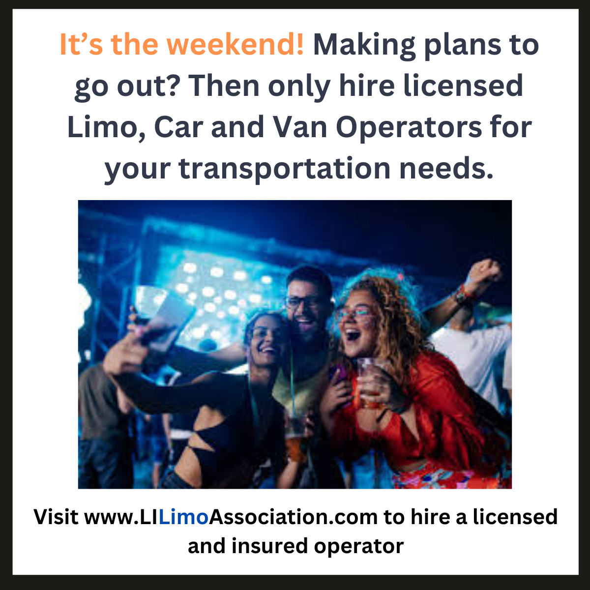 It’s the weekend! Making plans to go out? Then only hire licensed Limo, Car and Van Operators for your transportation needs. #LILimoAssociation #HireLicensed #LongIsland