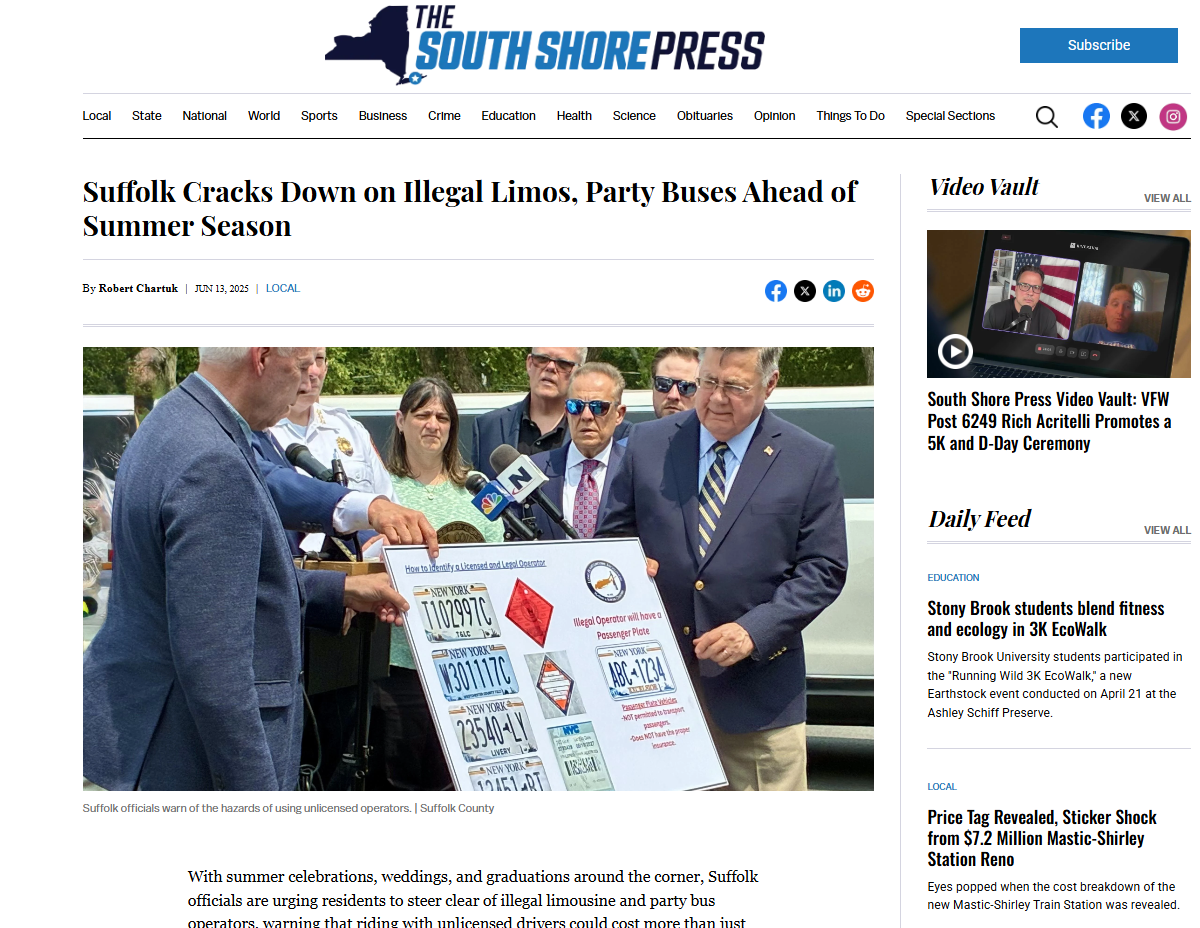 Thank you to the South Shore Press for covering our press conference with Suffolk County Executive Ed Romaine and Legislators McCaffrey, Stark and Donnelly. It is critical that residents check before they book and only hire licensed and insured operators for their transportation.