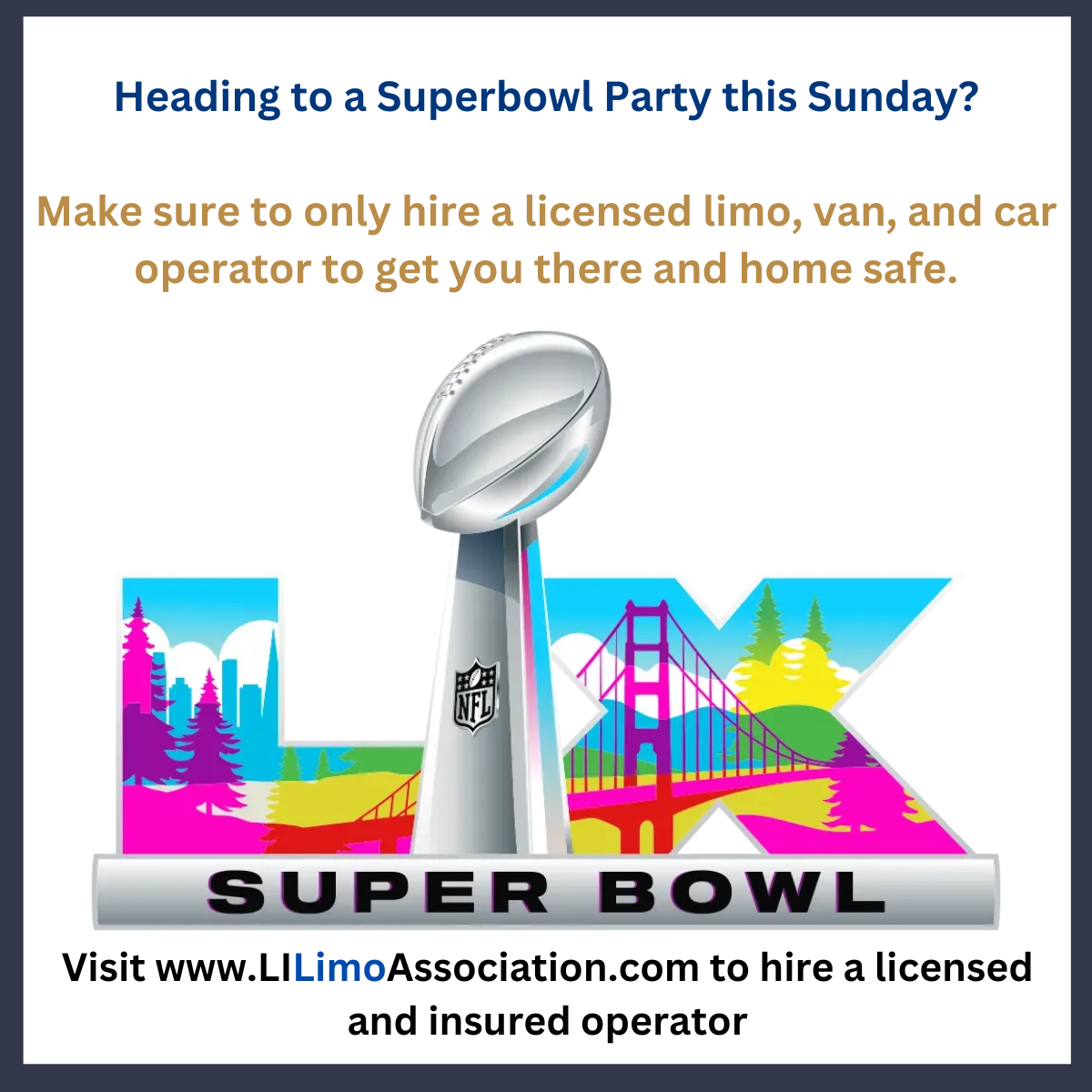 If you’re going to a Super Bowl party this Sunday make sure you hire only licensed car, van, or limo operators to get you to and from your destination.
