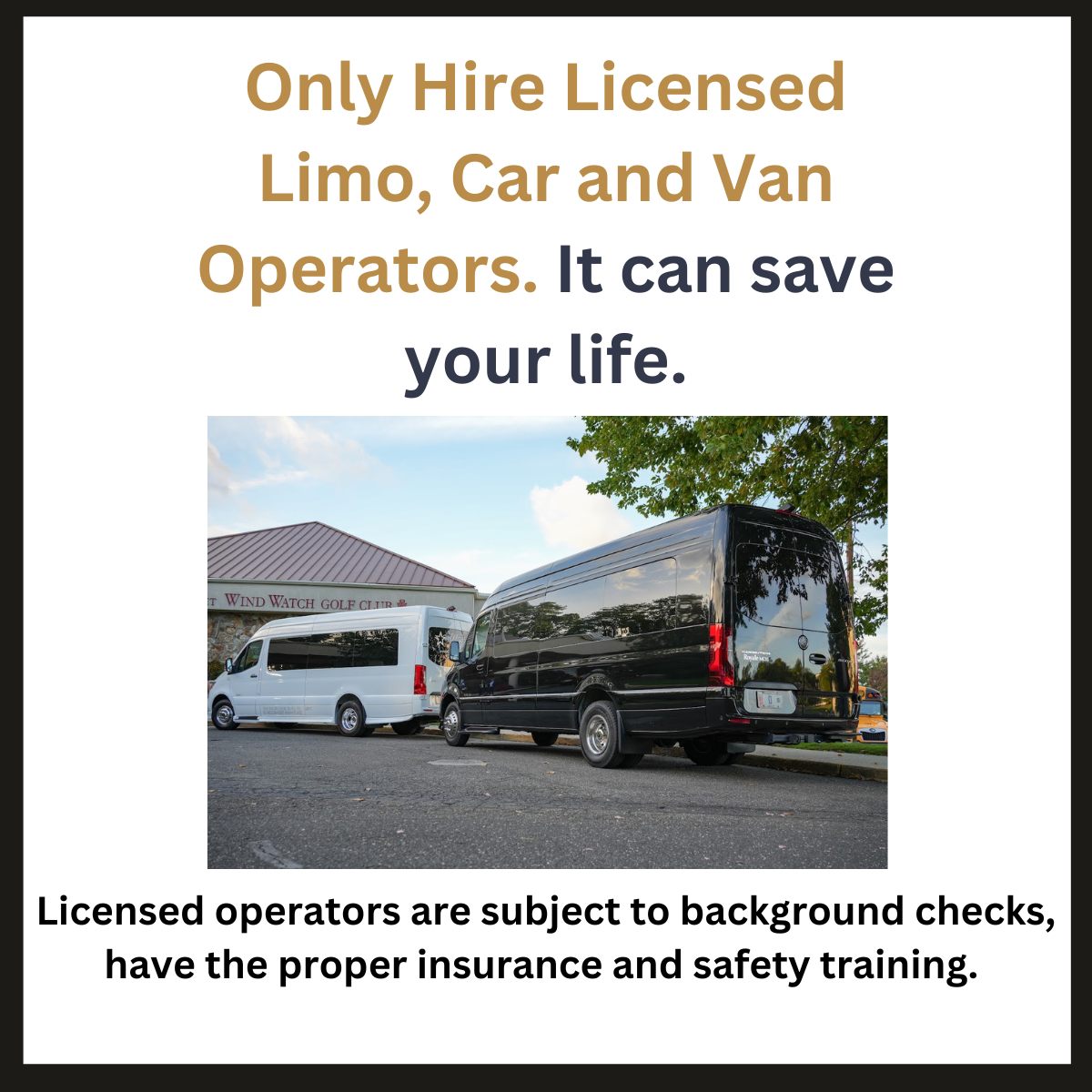 Licensed limo, van and car operators are required to have background checks, carry insurance, and have safety training which provide passengers with peace of mind.