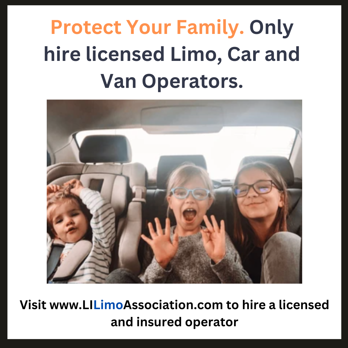 Your family’s safety is your top priority. It is ours too. So, when you are booking a car service to drive you to the airport, or to a memorable event, make sure you only hire a licensed operator. You will know who your driver is, you will have the proper insurance to protect your family, you will know that the driver has a background check and is trained, and the vehicle is safe. Unlicensed operators are illegal and put your family at risk. Only hire licensed! #LILimoAssociation #SafetyFirst #DotheRightThing